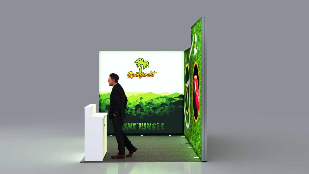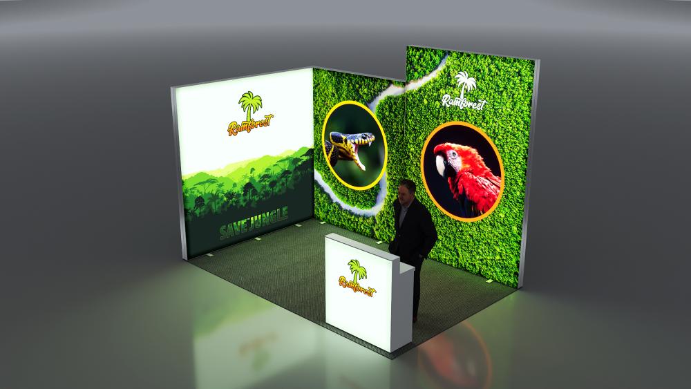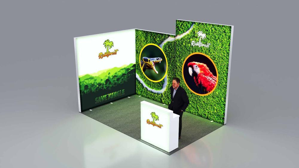 Professionelle, eindrucksvoll hinterleuchtete Messestand-Lösung für den perfekten Werbeauftritt Ihres Kunden.