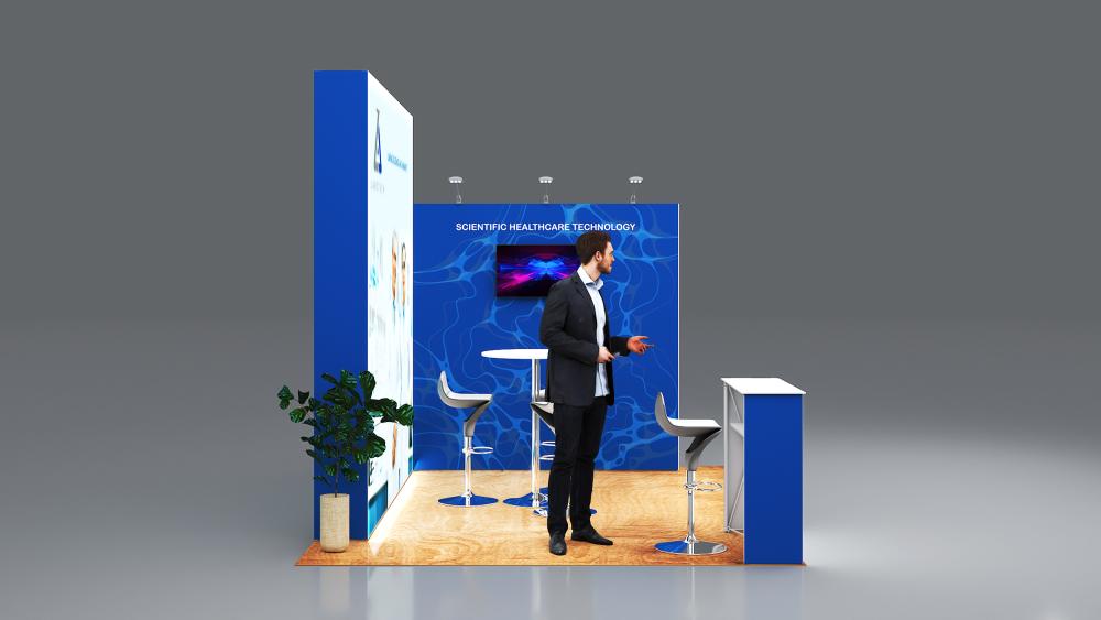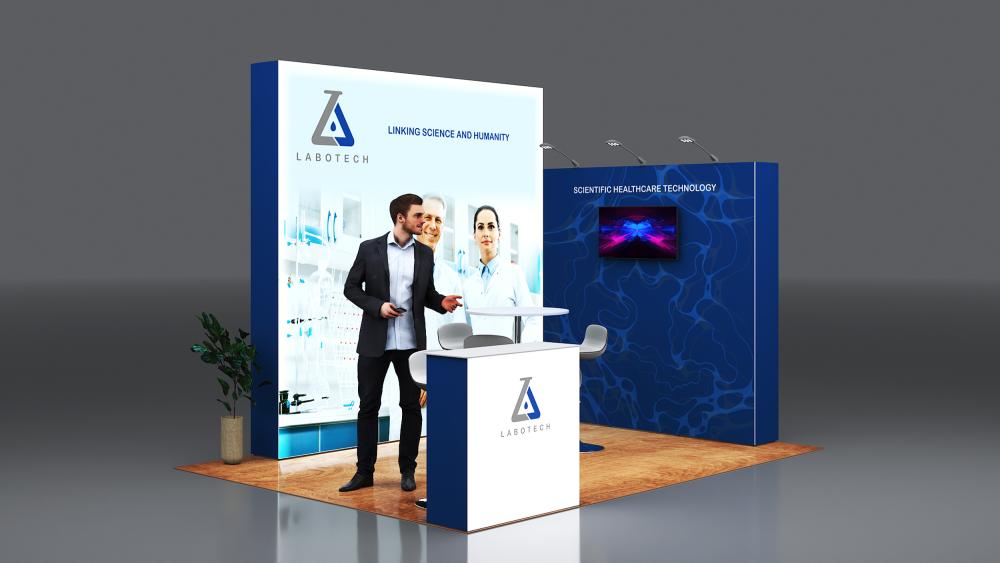 - 1x po15.3c-1040sw seg®LED Theke mit weißer Tischplatte inkl. Rolltasche, Blockout Stoff-Rückwand und Grafik - wähle eine Tischplattenfarbe aus silber oder weiß