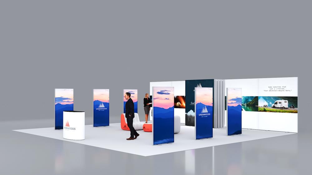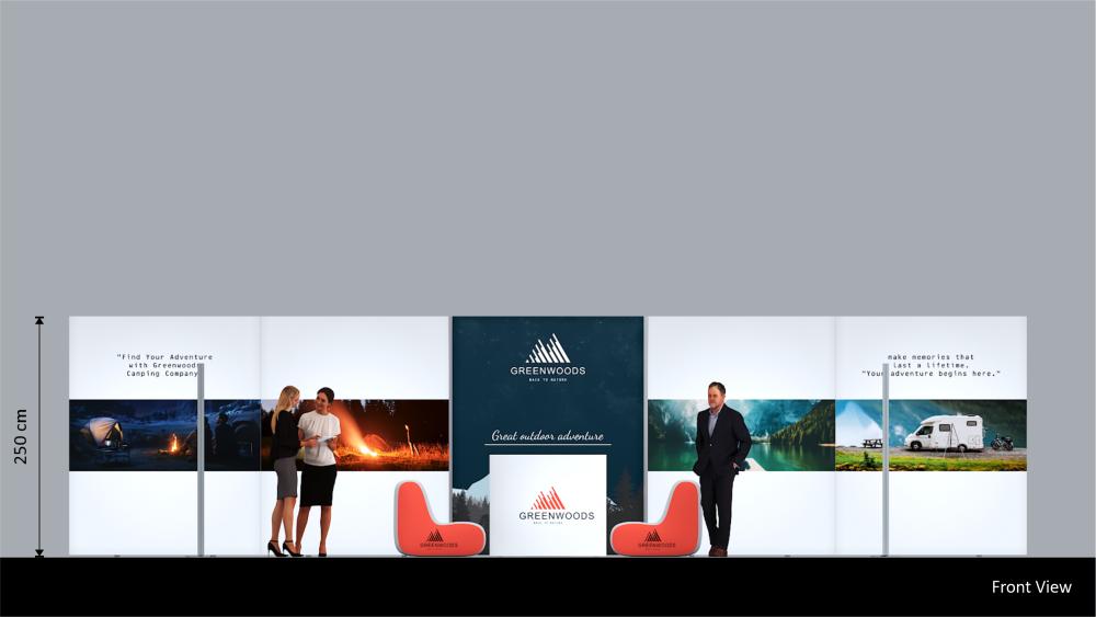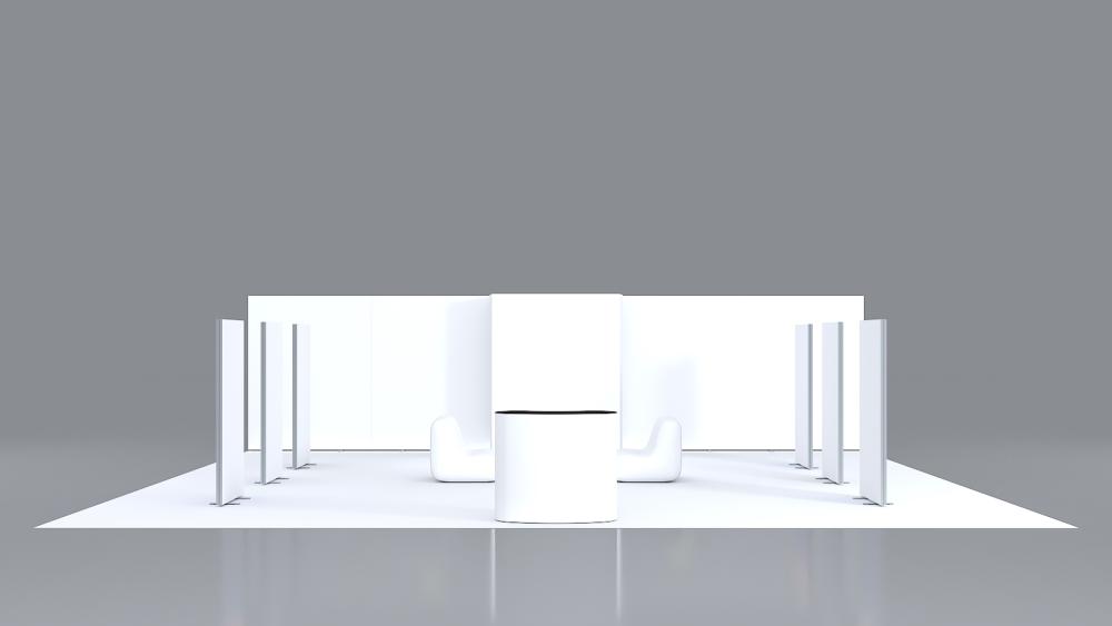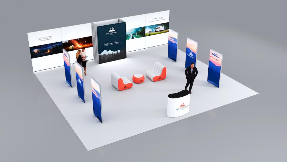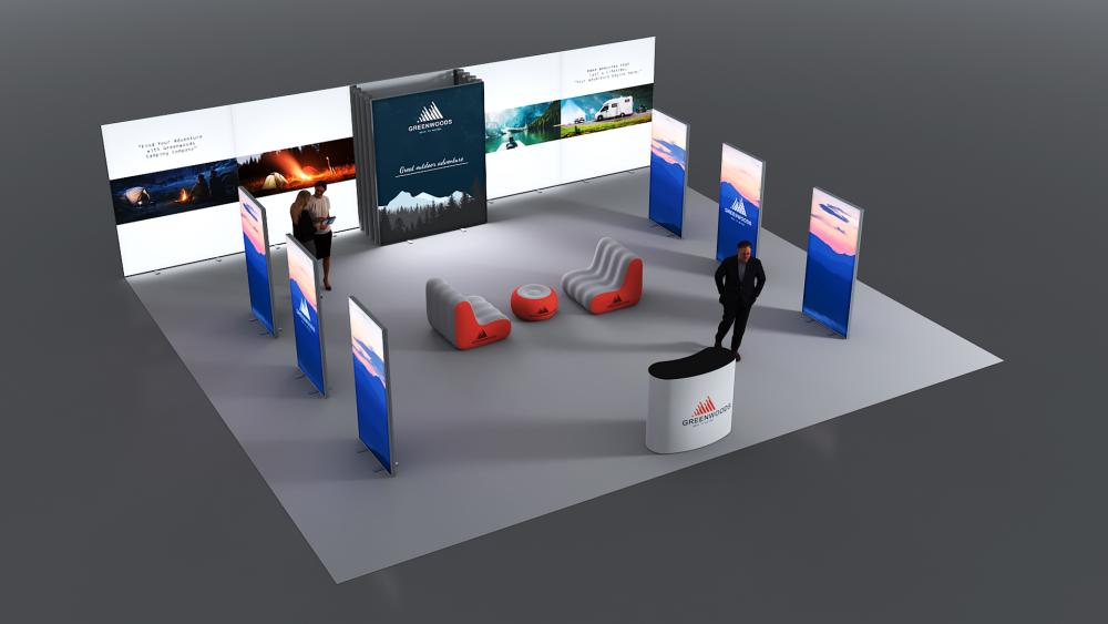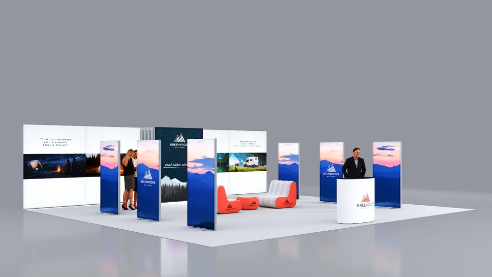 Großer, eindrucksvoll beleuchteter Stand für den perfekten Messeauftritt Ihres Kunden.